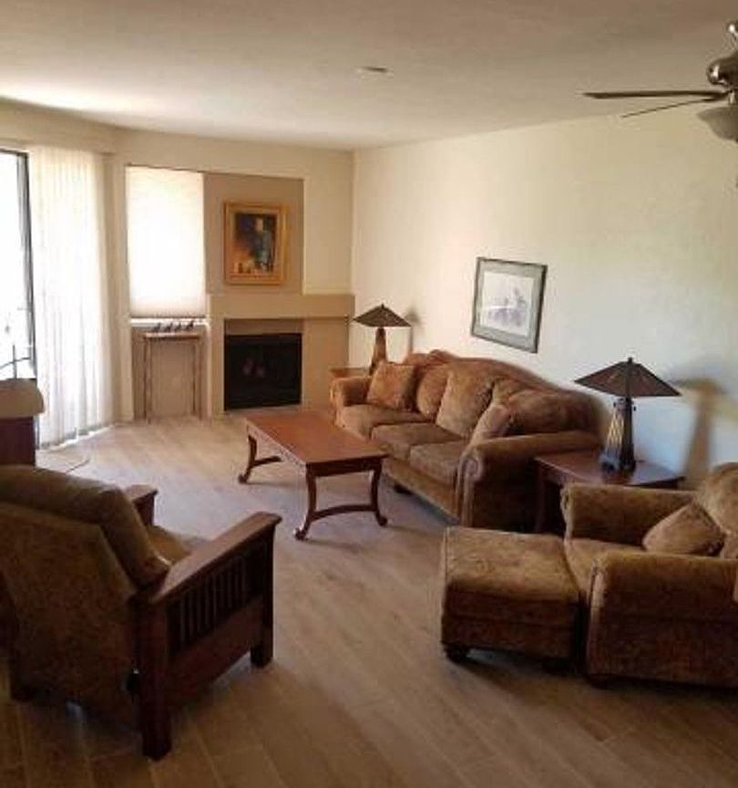 Beautiful furnished unit in a gated community in the Foothills. This unit is downstairs-(There are a couple of interior steps-see video) located in a great Foothills location and has been recently updated with all tile wood look flooring throughout and remodeled bathrooms. Fully stocked kitchen with housewares all appliances, great room with fireplace plus access to the wonderful sunny patio area with outside dining area. Queen bed in the master bedroom and full size bed in the guest bedroom. Master bedroom also has access to the wonderful outdoor sunny patio. Community features swimming pool plus outdoor heated spa!