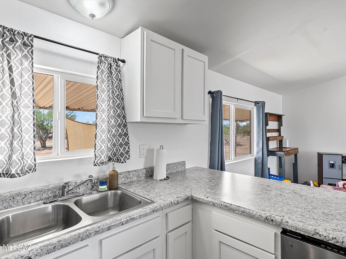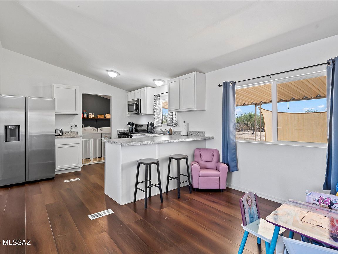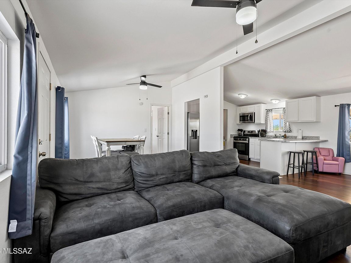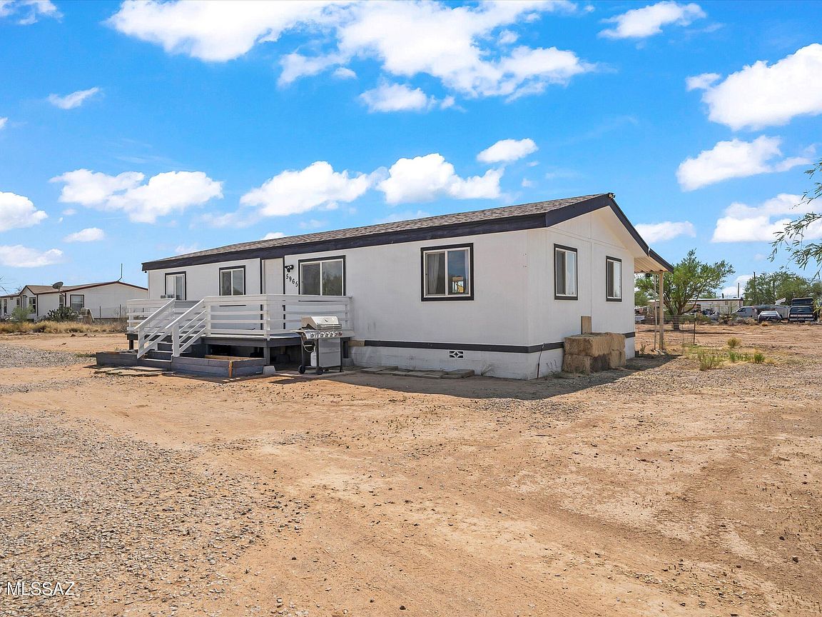 A charming 3 bed, 2 bath mobile home is now on the market! Nestled on an oversized 1 acre lot w/mountain views, this is sure to be the place you've been looking for! Inside you will find a spacious great room featuring vaulted ceilings w/exposed beams, elegant wood-look flooring, and neutral palette throughout. The kitchen is equipped w/shaker cabinetry, ample counter space, stainless steel appliances, and a peninsula w/a breakfast bar. You'll love the primary bedroom, showcasing soft carpet and a private ensuite for added comfort. Also including a covered patio where you can sit back and enjoy a relaxing summer evening, this home is a true gem! Don't miss out!